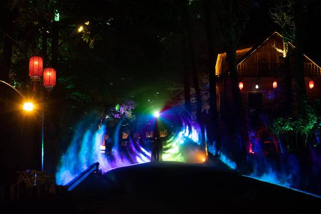 当然山间的晚上也不会让你感到无聊,有各式各样的演出,整个木屋区都亮起了五彩缤纷的霓虹灯,而且还有酷炫的激光灯效。