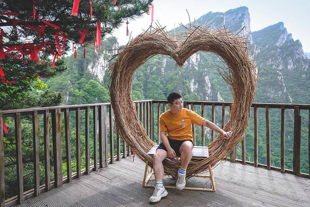 从索道步行10分钟的地方,就有一个爱心形状的编制座椅,可以透过看见对面山峰鸡角尖的景色。