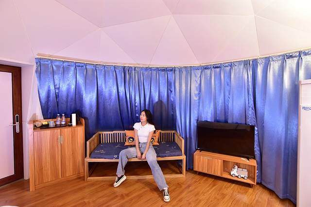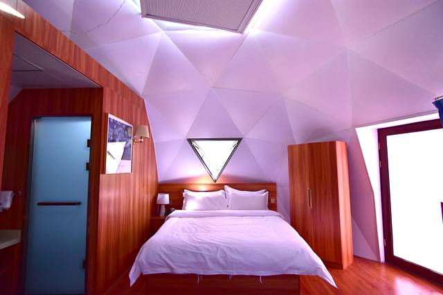 这次我住进了这间玻璃星空房,蓝色的玻璃外墙,太有立体感了,外面看上去好像不大,走进去发现里面并不压抑,圆形的房子大概有40个平方。