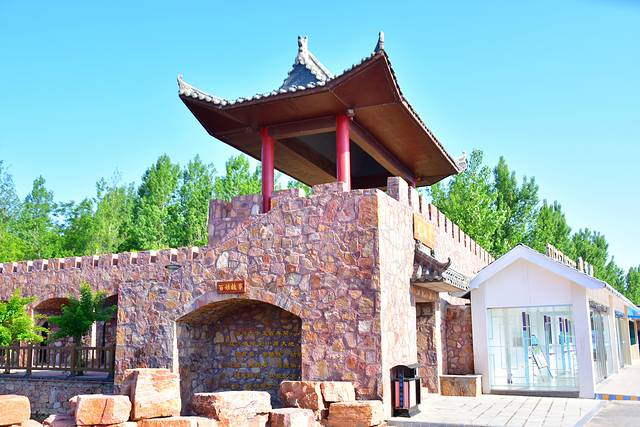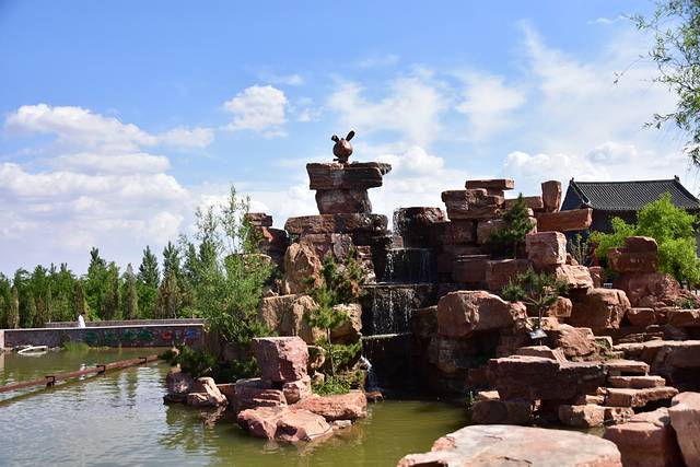 景区入门口就有红石假山、水车、流水,这一小块人造景观也算比较精致。