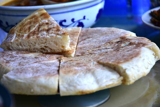 手工烙馍,这家店的手工烙馍烙得太好了,大家很快就给吃完了,然后叫老板再上了一盘,用它卷着菜吃,味道就是棒!