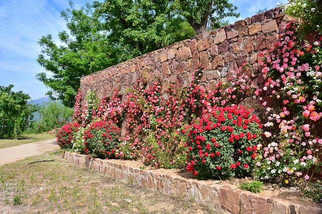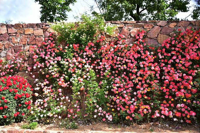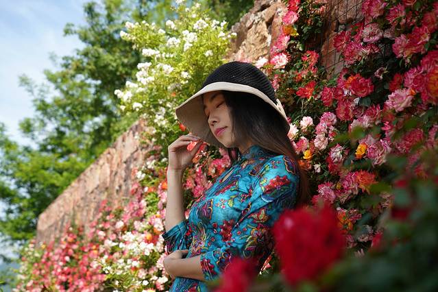 除了地面的一一块一块的花田,玫瑰庄园入口处的长长的石头围墙上面,也爬满了花,挺适合拍人上照的。
