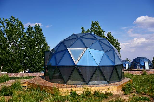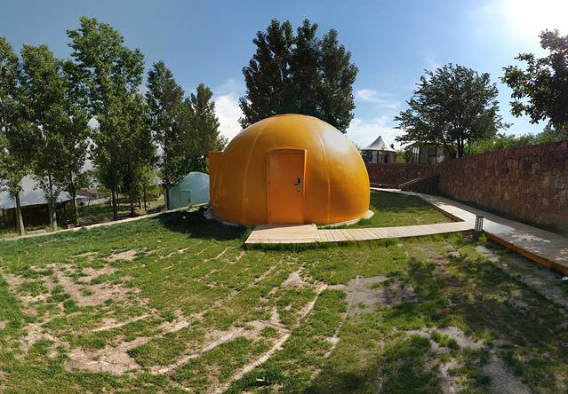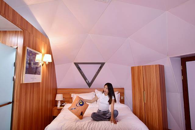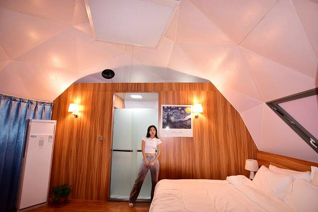 这个太空舱就像一个半球扣在地上,走进去一看,向着湖面的一边,安装了玻璃落地窗,坐着沙发赏风景,把酷热锁在外边,把窗帘拉上就是自己的世界,房顶有一个圆形的天窗,可以用遥控器控制打开或关上,我就开着窗子睡,让早上的阳光把我唤醒。