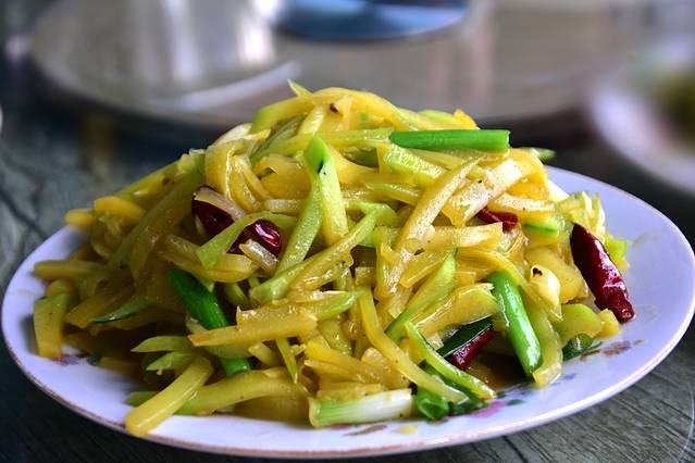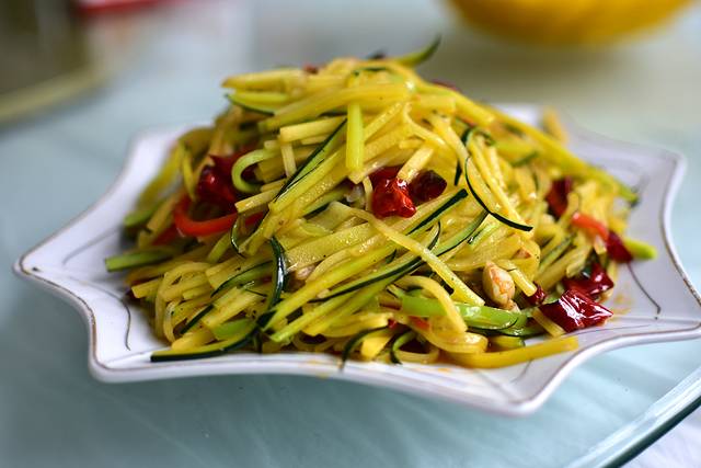 南瓜丝,这种是那种比较嫩的小南瓜,这样的南瓜丝口感好。而那种老老的粉粉的南瓜就不适合这种炒法了。