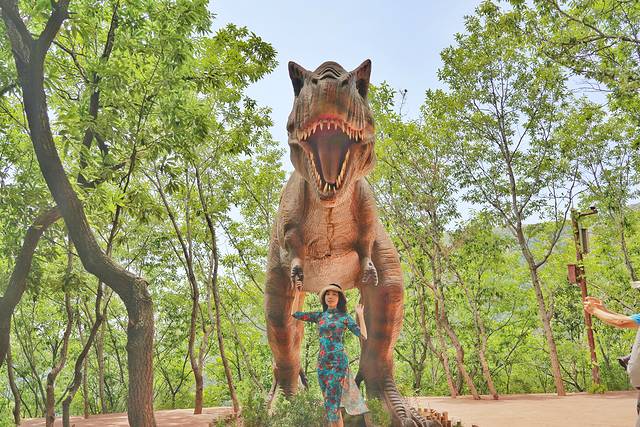 巨型的恐龙啊,会吼会动,只有站在下边做对比,才才能拍出它的雄伟,小朋友可别吓哭了。