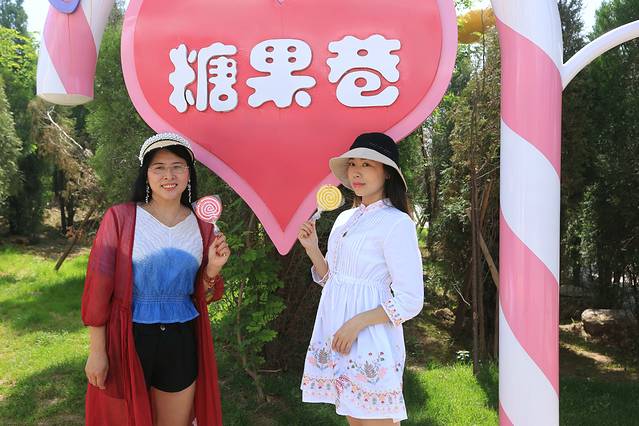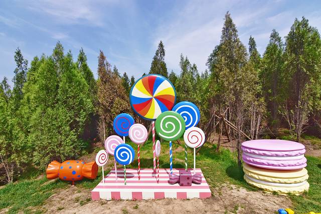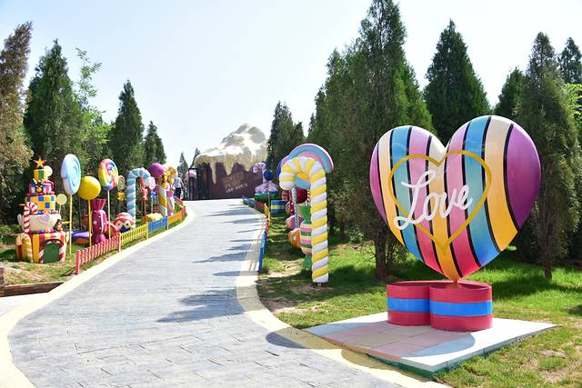 糖果巷是一条弯弯的小径,小路两旁布满了各种各样的卡通元素,比如有一个一心一椅,坐在上面拍照太卡通了。情侣一定要在这里拍合照哦,这就叫做心心相印。