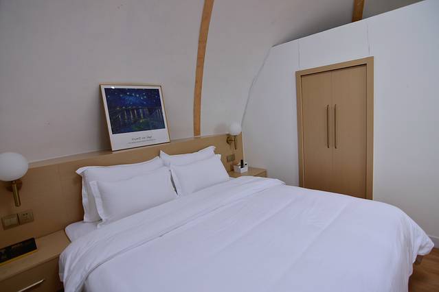 看这张我拍的照片,太空舱内的格局一清二楚,沙发对着全景窗,一张舒服的大床,在景区逛累了,可以在这里好好的休息。床头就是梵高的星空画,其实等到晚上我早早的就睡着了,没有去注意看星空,躺在床上看星星,可真是浪漫的事呀,所以情侣们一定要住住这个星空房,躺在床上看星空,要加入未来计划清单。