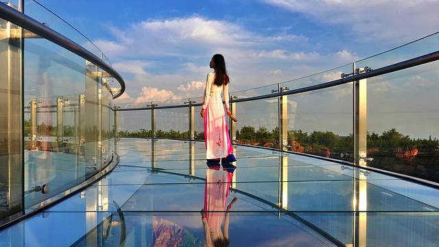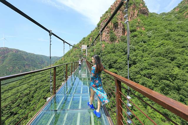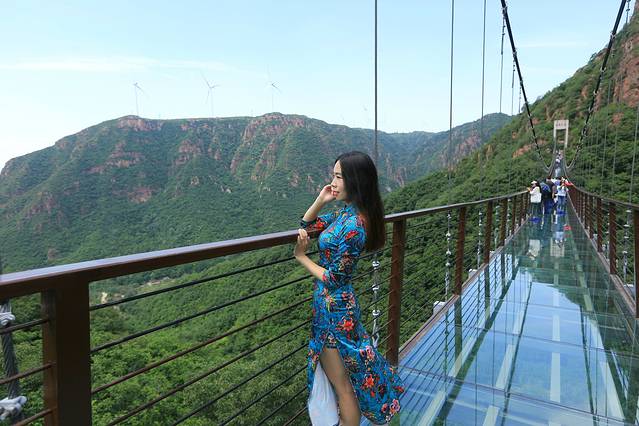 贯穿于峡谷之间,凤凰天桥直直的一条连接两边的山峰,这座玻璃桥,修建的比较早,号称中原首座玻璃桥,现在玻璃桥可是遍地开花,但是这里的风景是真的好,山间完全没有杂乱的建筑,氢酸氯水保护得好。 走在长长的玻璃桥上,满眼都是翠绿,只有山。