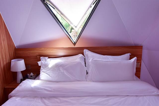 首先呢,一张大床占据有利位置,床头有一个三角形的窗户,想要通风可以撑开。房间配备了衣柜、电视、沙发、小吧台,白天外面很热,空调一开,房间也渐渐凉下来。