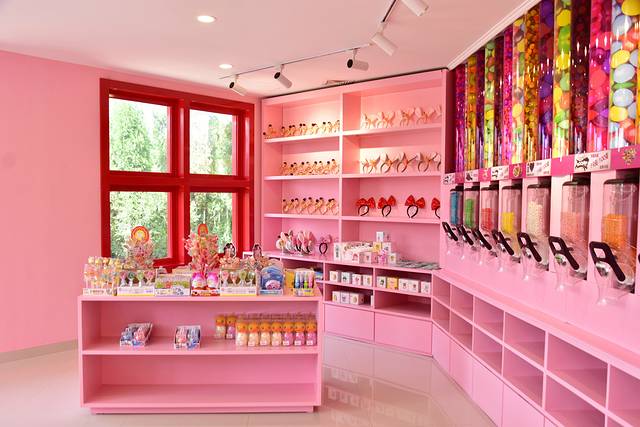 走过验票处,前方左手边就是一座粉红色的小房子,它是糖果屋,粉红色的卡通房子里,摆满各种各样的波板糖,还有蝴蝶结头梆 ,等等。