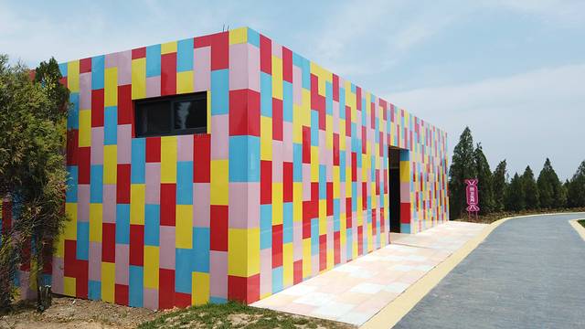 再往前走,有一个七彩色的方方正正的房子,原来是七彩洗手间,洗手间还是彩虹色的,别提有多欢乐。