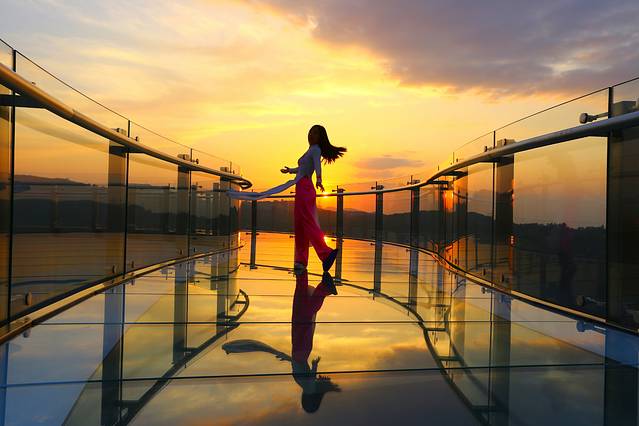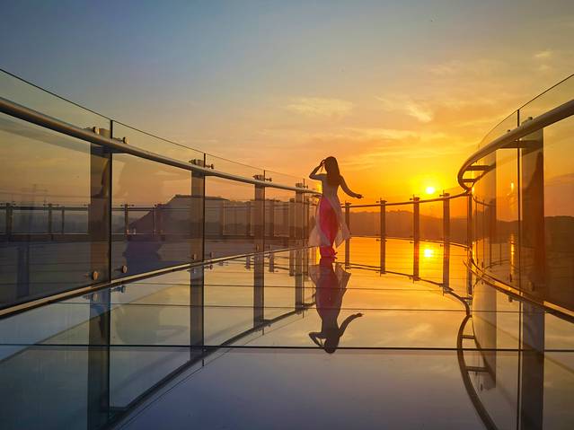 落日和玻璃环廊真是很好的搭配呢!夕阳照在玻璃墙面上,处处都是金黄色的落日余晖,要是穿飘逸的裙子拍照很美呢!