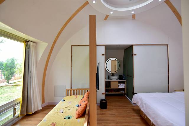 在伏羲山的第2个晚上,我还住星空营地,这次换了一个主题房,从蓝色玻璃房换到了黄色的太空舱。