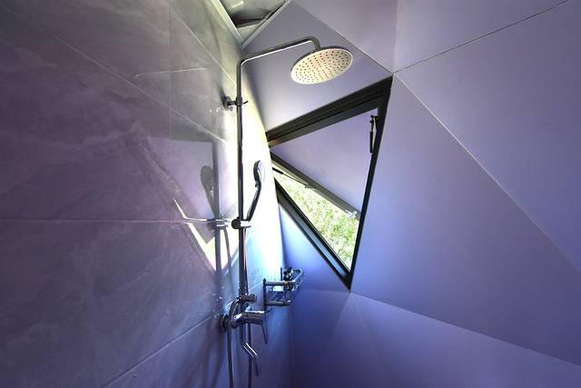 整个圆形的空间 ,切割了一小部分空间,作为淋浴房、洗手区、卫生间,功能齐全。