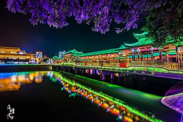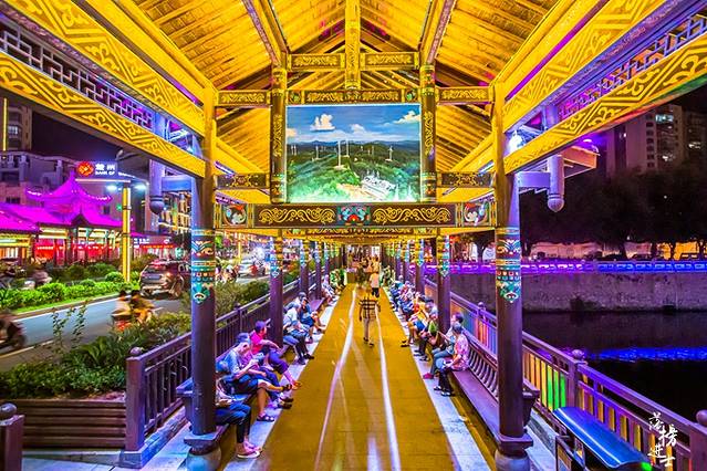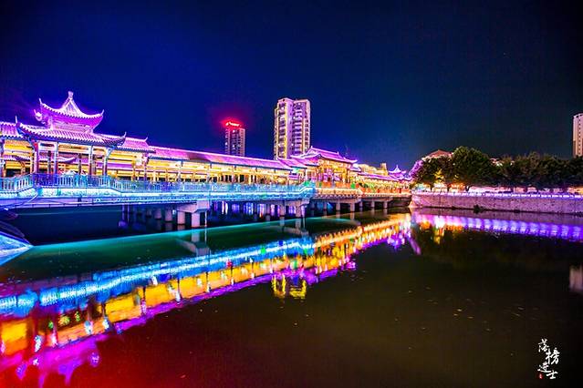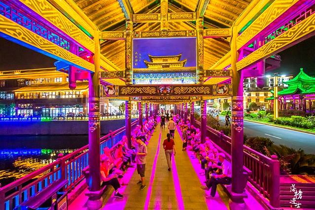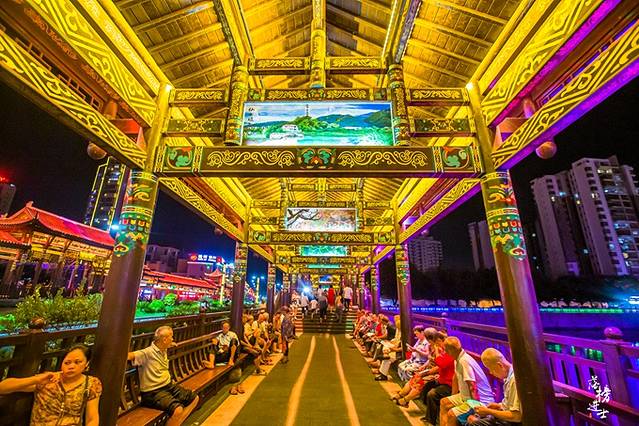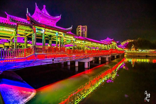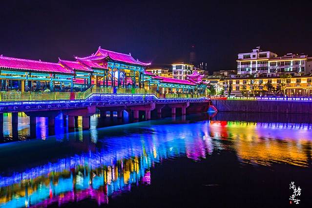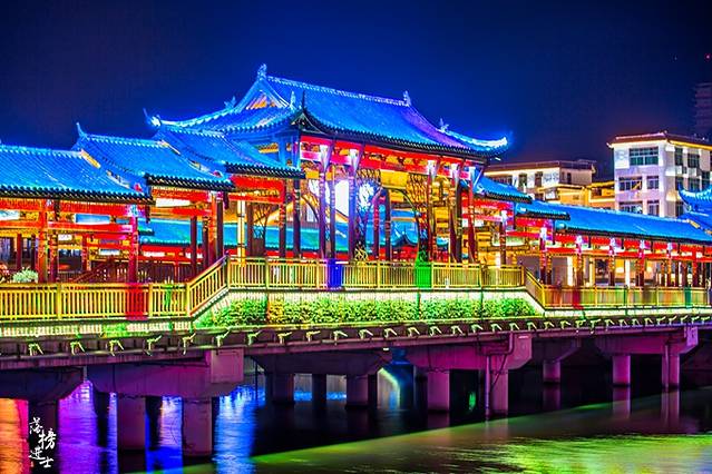 每当夜幕降临,华灯初上,璀璨的灯光便会照亮解放桥的飞檐翘角、雕花木窗。远远看去,整座廊桥宛如一道亮丽的彩虹,充满了独特的古典美。