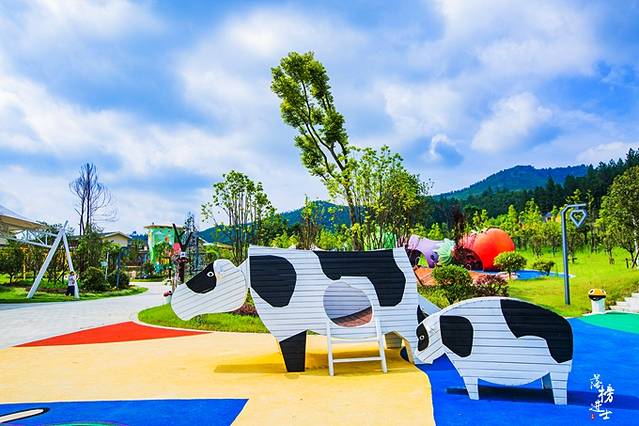地面被涂上各种缤纷色彩,萌萌的奶牛不仅小孩子可以爬上爬下,还是大人的绝佳打卡地,配上蓝蓝的天空绿绿的树,无论哪个角度拍出来都是美美的。