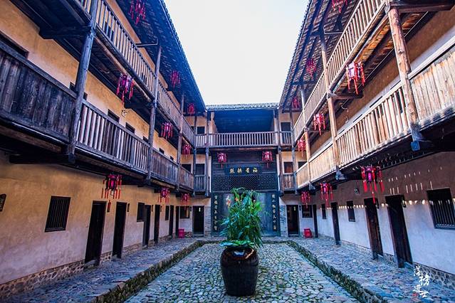 福星围是两座围屋中较早的一座,建于清朝咸丰年间,从外表看就给人坚不可摧的感觉,这种围屋为夯土砖墙结构,被称为“土围”。走入其中,仿佛走入一个幽静的世界,整个建筑高三层,每层楼均有17间房,围合出一个密闭空间。再加上土黄色的墙壁和深褐色的木栏杆,颜色深沉,更增加了几分庄重肃穆。