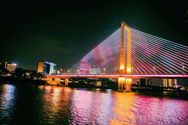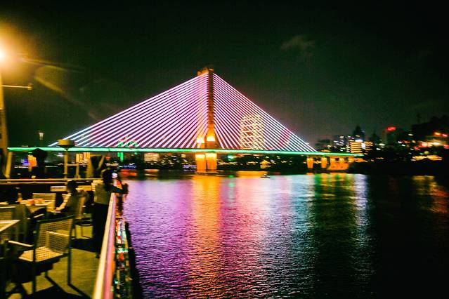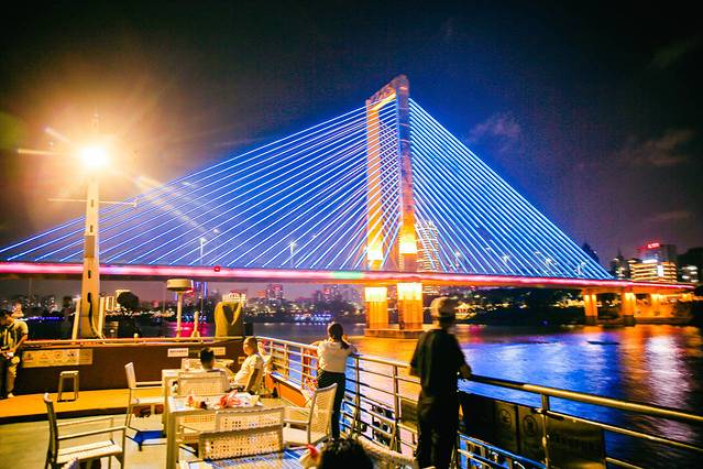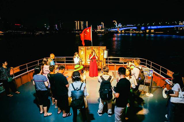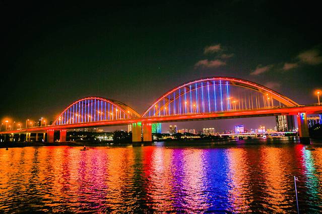 在南宁民生码头,乘坐游船,夜游邕江60分钟饱览邕城夜景,夜游航线从民生码头至葫芦鼎大桥,穿过凌铁大桥、白沙大桥、葫芦鼎大桥等标志性桥梁建筑景色很美,而且中途还有表演,真的很惬意!吹习习凉风赏邕江夜景,携家人朋友一起来,非常舒服。 我们也结束了第二天的自驾安排,但是觉得不过瘾,以后有机会还要来,慢慢的体会这个城市生活。