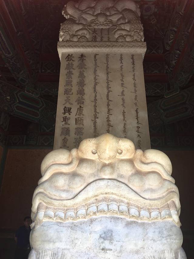 穿过大红门,迎面是碑楼。碑楼中立有两通高大的“圣德神功碑”,碑上分别用满文和汉文两种文字镌课着顺治皇帝一生的功绩。