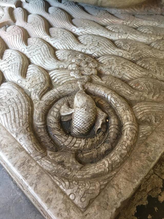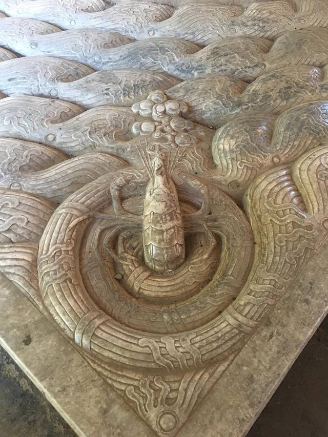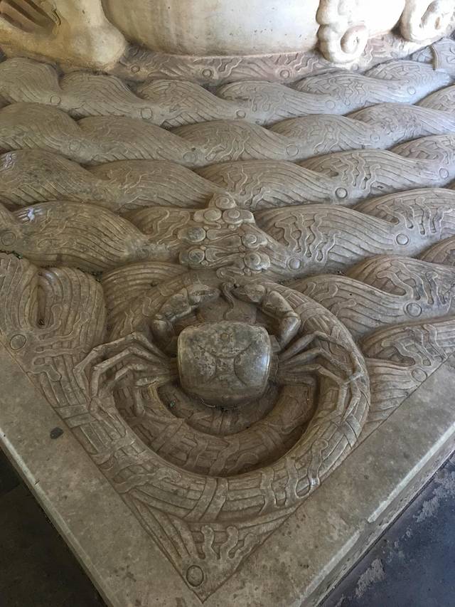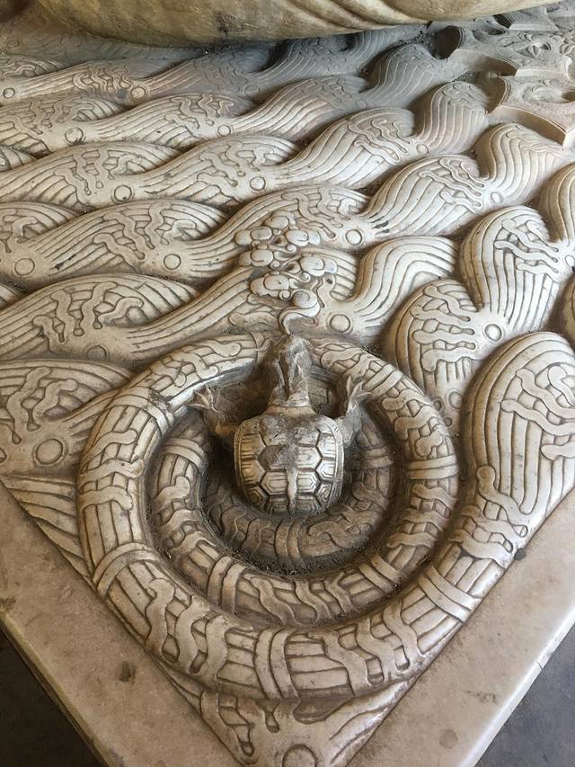 赑屃脚下趴卧在海水波澜纹石板上,它的四个角上,分别雕着四个江河湖海里的动物,他们分别是鱼、鳖、虾、蟹。