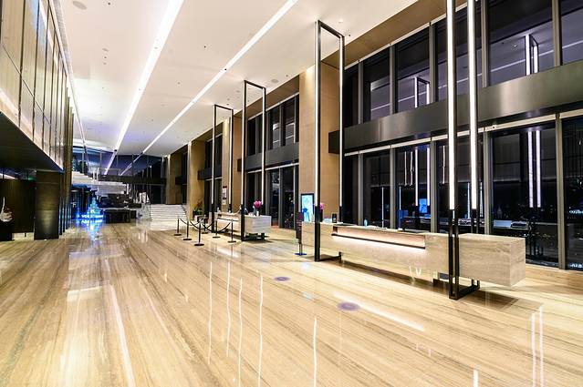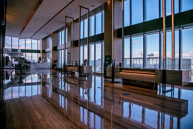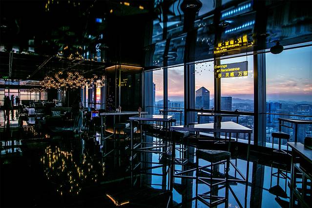 酒店的大堂位于57楼,宽敞的落地窗玻璃设计,将深圳湾周边的风光一览无余,尤其是日出日落,美的让人心醉。