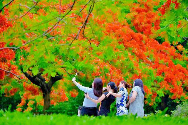 走进深圳湾公园,沿着林荫道,处处可见姹紫嫣红,随风飘舞的花朵,好像在向游人招手;鸟儿在枝头起劲地唱着歌儿,婉转悠扬。