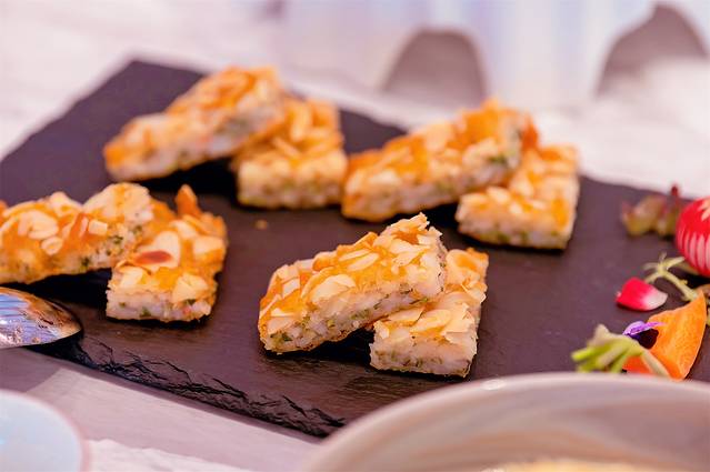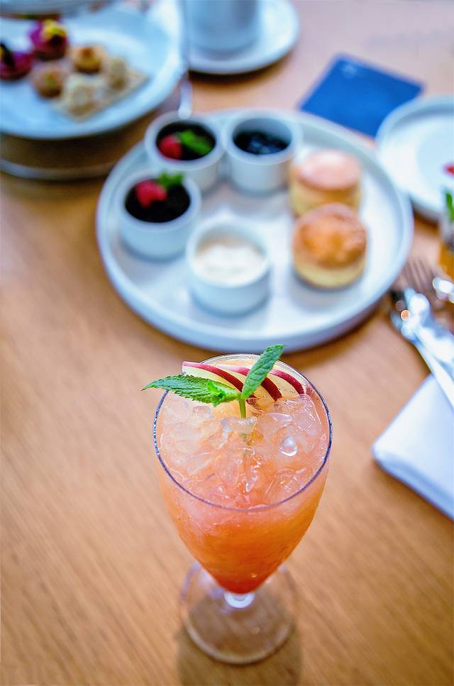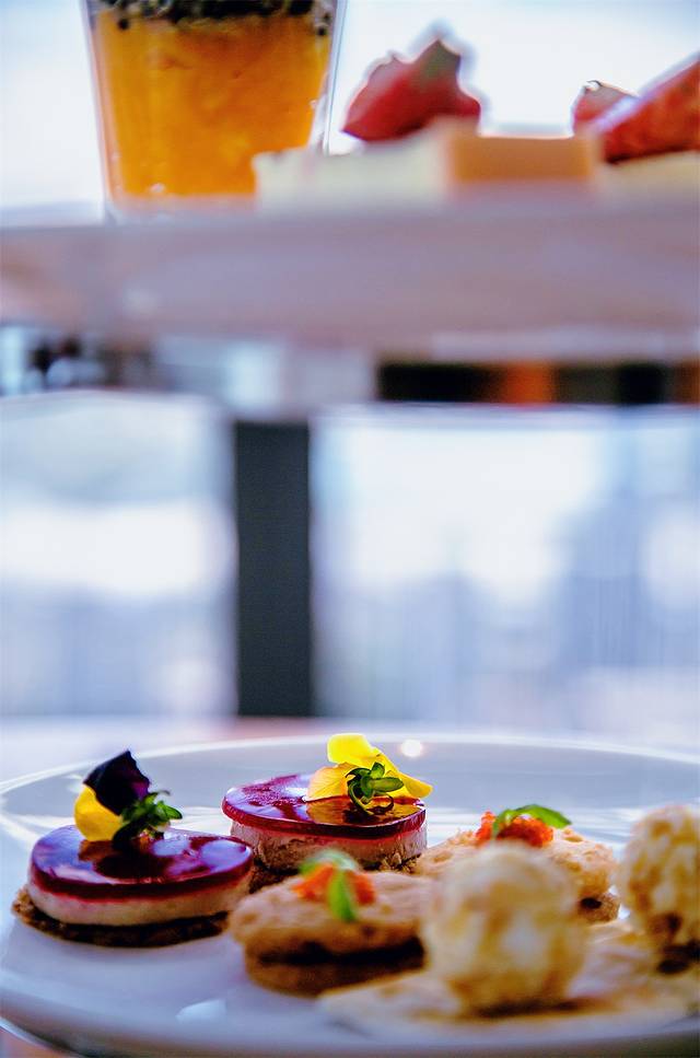 马卡龙、海盐芝士蛋糕、南瓜藜麦虾杯、提拉米苏、杏仁坚果芝士球、三文鱼蟹子三文治、焦糖巧克力蛋糕、鹅肝三明治、司康饼、两杯无酒精鸡尾酒(百香果莫吉托,深圳湾日落)两杯咖啡或茶。