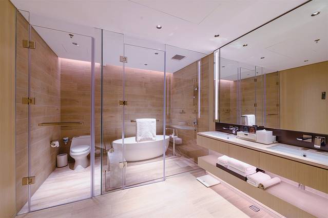 酒店的大床房同样设计独特,视野开阔,可以大饱眼福窗外的风光。浴室是半开放式,玻璃设计,通透明亮,设计感十足,走进房间给人第一感觉就是宽敞、舒适。完全不用担心隐私问题,酒店的玻璃浴室采用的是雾化钢化玻璃,轻轻一按,就可以起到很好的隐私保护。