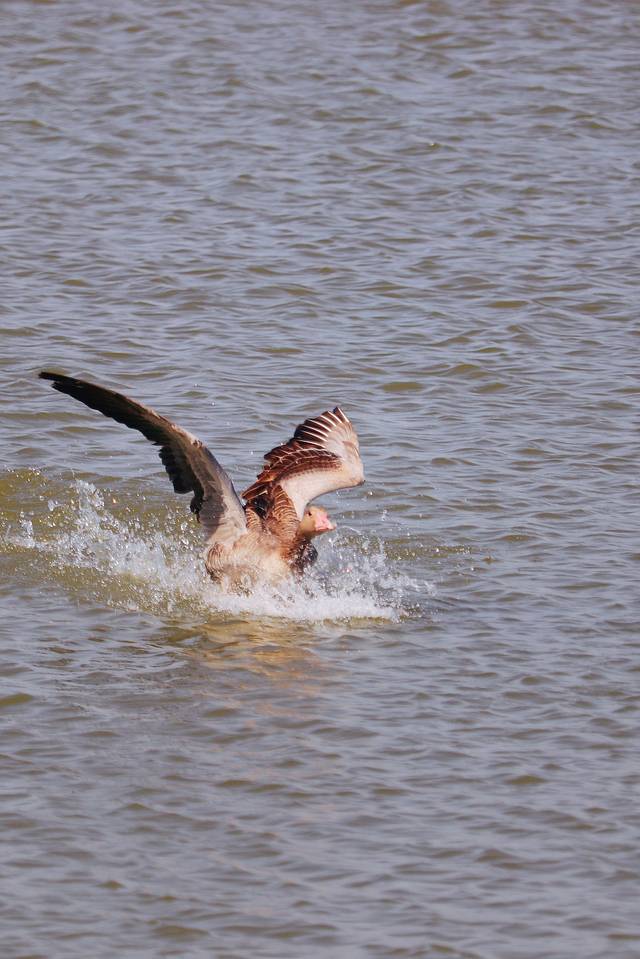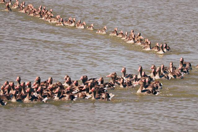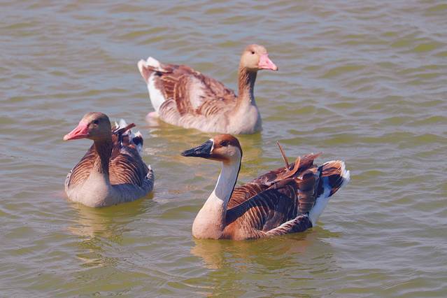 这里还有大雁放飞的项目。百只大雁从雁舍放飞,向着栈桥的方向飞来,浩浩荡荡。五月正值大雁换羽,所以飞起来的少一些,但是看到了大雁们整齐划一在水中列队游泳的画面,特别有秩序,真是很有团队意识的动物。