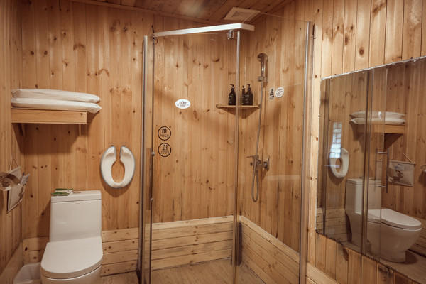 洗手间干湿分离,洗澡也是非常的方便,还有给小孩准备的马桶圈,所以这里也是非常适合一家人来度假的。