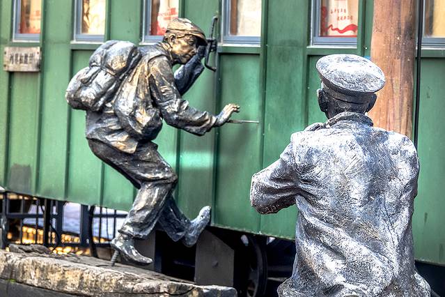 小镇不大,约百余米长,一端铁轨上是火车头、车厢,一端是一架飞机,可都是实物。据说火车头还可以正常运行,喷气、鸣笛,这在全国也是仅此一处。