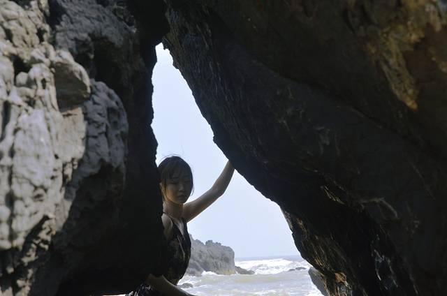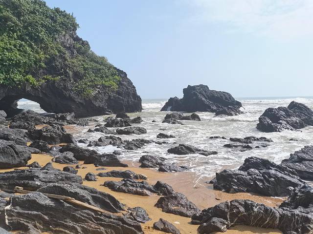 面对大海的右手边是 海豚湾 ,可以看到一个尖尖的黑色礁石