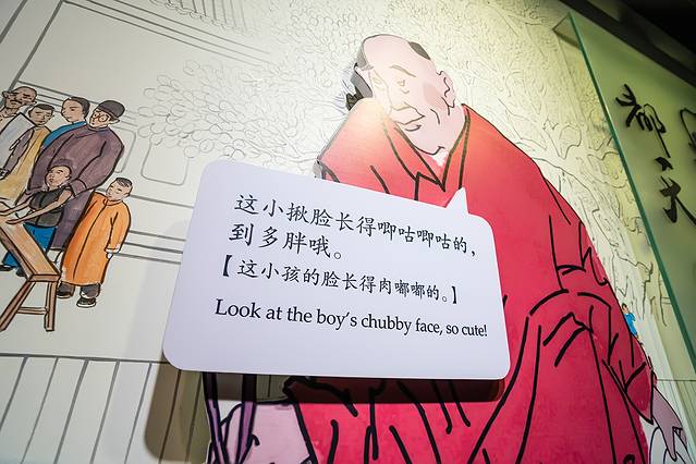 穿过古街则来到了淮安庙会的展示区,在一侧的对话板上,有一些有趣的淮安俚语,只要触碰一下展板对话框,庙会人物就会讲出又土又有趣的淮安方言,真的太好玩了。