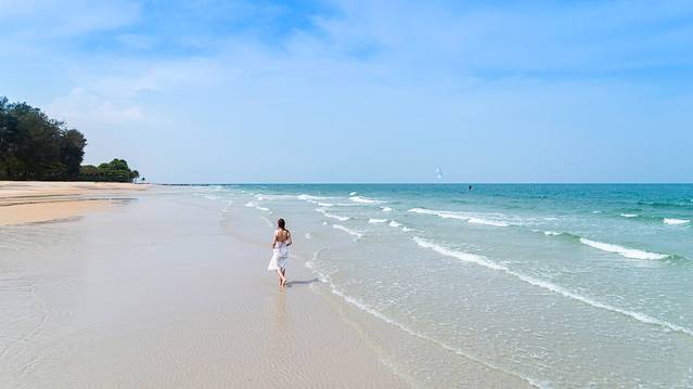 华欣海滩位于市区东侧,以其干净广阔的特点而闻名,并可欣赏绝美的日出之景。这里提供躺椅和沙滩伞租用,并贩售各式饮品、水果和零食,游客们可在此获得身心灵的休息与放松。此外,这里还能参与众多水上活动,如冲浪、帆船、滑翔伞和香蕉船,还有沙滩骑马的特殊体验。