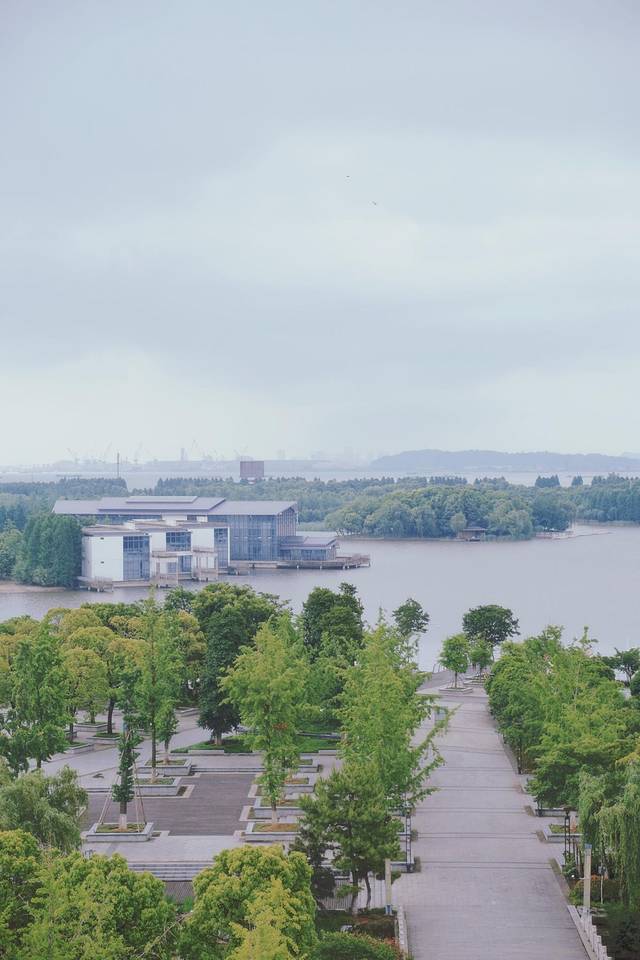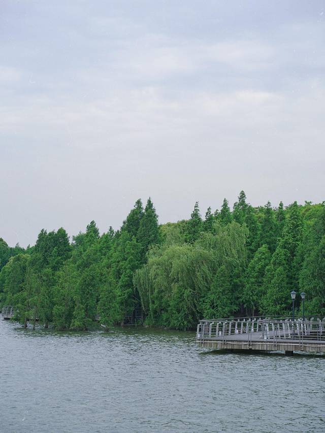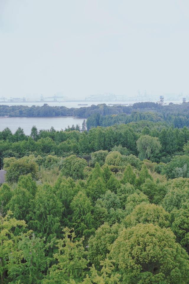 登的高望的远,从这个角度,我得以看到这片静谧的湖景:自脚下延伸出去的,是整片郁郁葱葱的树木,拥挤着、把彼此推向目光的远方。镜面似的湖水果真犹如镜面,雾气昭昭之下反射着点点天光云影,把对岸的景致烘托地仿佛海市蜃楼般仙气十足。
