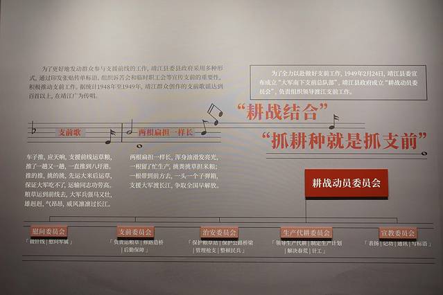 “一切为了前线,一切为了胜利。”据记载,渡江支前最艰巨的任务是筹船,靖江人民便自发将船只划出来,甚至拿出家中建房的木材、床板,献出老人“寿材”木料,赶制新船。在那个并不宽裕的年代里,靖江支援了前线粮食300万斤、草料950万斤。渡江开始后,靖江更是投入了1000多条木船、2000多名船工和水手,还有6000多名民工组成的民工团,随大军南下转战,直到9月份才返回靖江。
