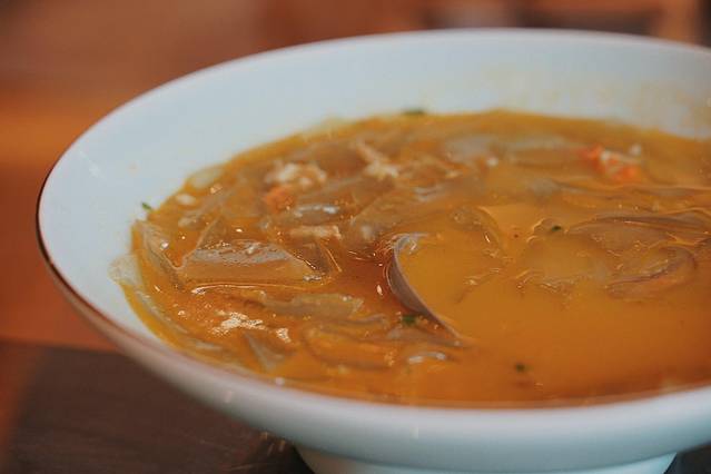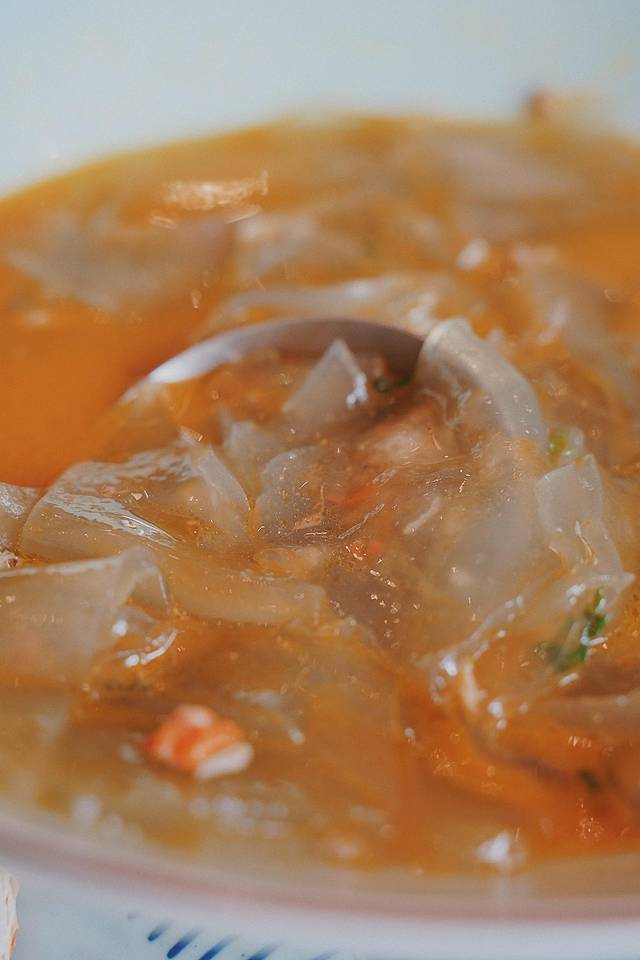 色泽靓丽的蟹黄粉皮,韧性和柔软度拿捏得刚刚好,大块的蟹黄漂浮在晶莹剔透的粉皮之中,酸菜的加入让汤汁自带有一股淡淡的可口的酸味,不用再加蟹醋,也将鲜香衬托的恰到好处。