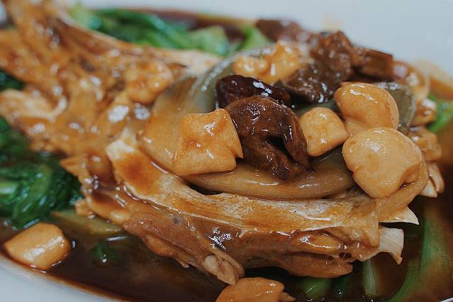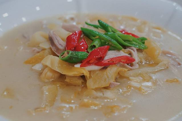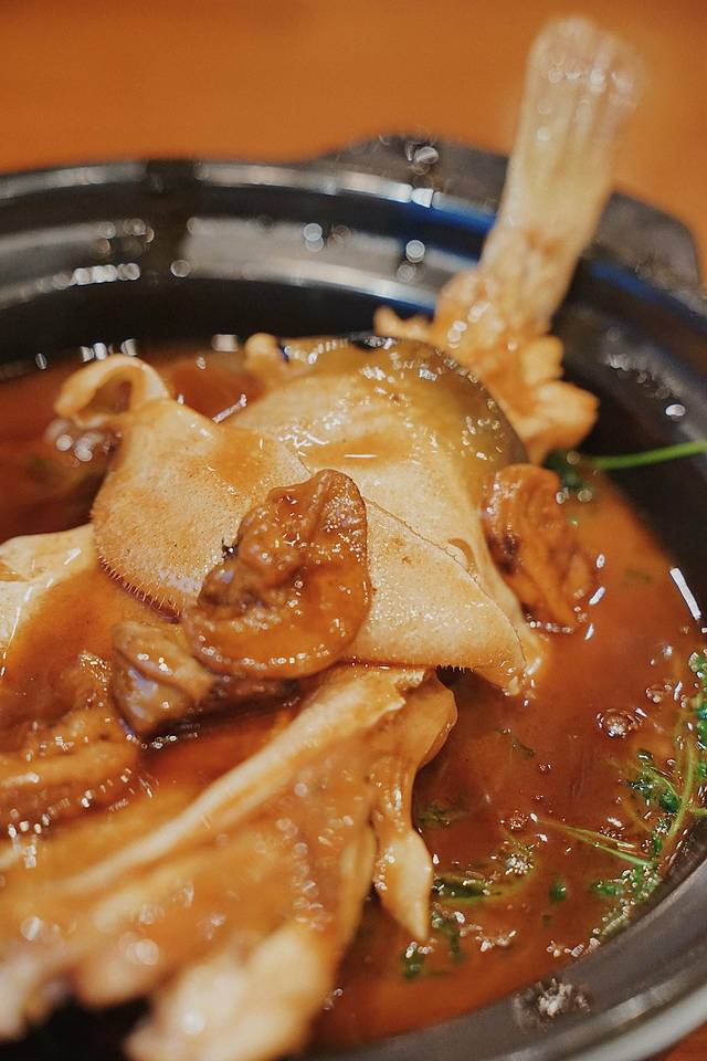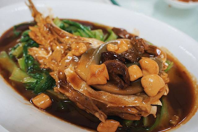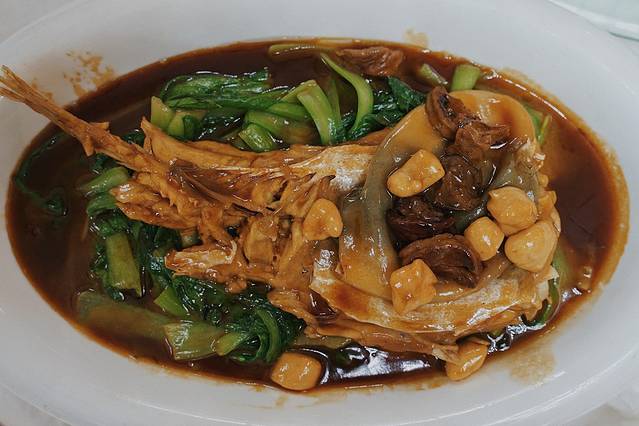汤汁咸甜适口,直接入口偏咸却因此成为了米饭的好搭档。人工养殖的河豚在鲜美程度和肉质细腻度上都较野生河豚差别很大,但现杀现做依然能够在很大程度上弥补这种遗憾。鱼肉嫩滑,鱼肝醇香,鱼皮在牙齿的摩擦间发出“咯吱吱”的脆响,盘底的小青菜爽脆清甜,被汤汁的裹挟下完成了一次生命的完美升华。