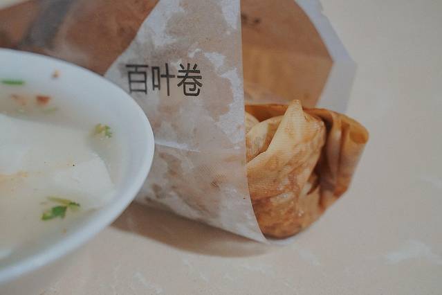 层层叠叠铺起来的百叶(也就是豆皮),均匀地刷上一层酱汁,刚刚出国的油条被压扁,和香肠、糯米饭、榨菜等一起被结结实实地包裹起来,这份沉甸甸的能量炸弹,是来靖江不得不吃的——百叶卷。