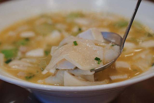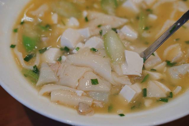 当地人的“锅贴”,竟是我们平日生活中类似于“面片”的存在。河蚬的肉、柔滑的豆腐、丝瓜一同做汤,面片疏松的空隙中吸满了鲜美的汤汁。这道热汤面食,虽算不得精致筵席上的顶级菜肴,却总能让人的味觉仿佛在阅尽千帆后午夜梦回,品到一种属于妈妈的、温暖的家乡味道。