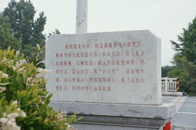 当年岳飞在此地安置好百姓后率军南下,百姓跪拜送行,送到此处岳飞下马,脱下身上的白袍,赠给老百姓。百姓为这件白衣专门建了一个祠堂,名曰“白衣堂”。