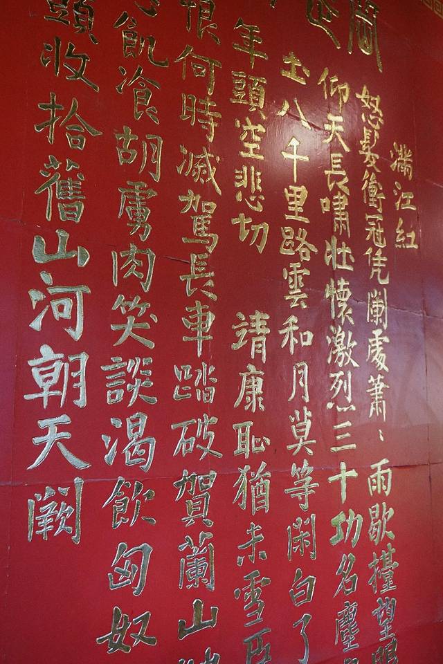 岳飞坐像置于殿中,头戴红缨帅盔,身着紫色蟒袍,臂露金甲,足履武靴。这血肉之躯,曾经一夫当关、万夫莫开,立志保这万里河山峥嵘永固,保这四方百姓安定富足。身后,红底金字的《满江红》依旧展现着震铄古今的气壮山河。