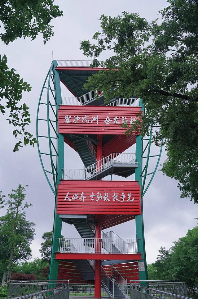 公园门口,一座高高的观景台从一进门就吸引了我的视线,钢架结构的高台由楼梯一圈圈盘旋而上。拾阶向上,偶然低头看到有点镂空的脚下,恐高的我不免一阵心悸。