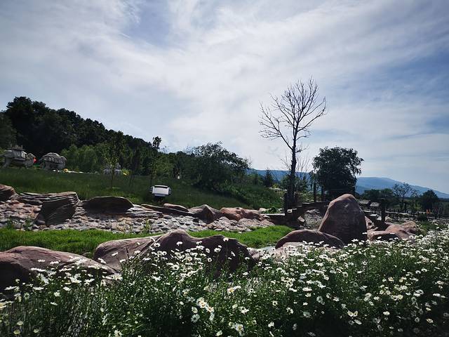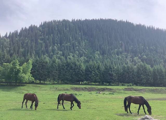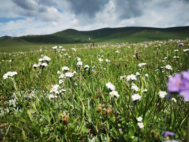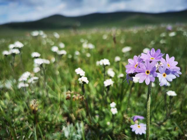 这片草原太美了,各种小黄花,紫花,白花。还有蝴蝶,蜜蜂,远处有马儿在吃草