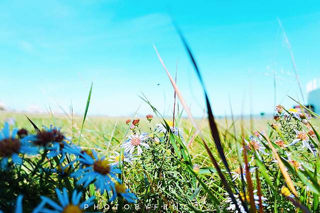 九月中上旬的天下草原还是绿绿的草原,蹲下来看,还有零零星星的小野花藏在小草中间,紫色的,洋红色的,还有黄色的,虽然比不上正当时,也不失别有风味;