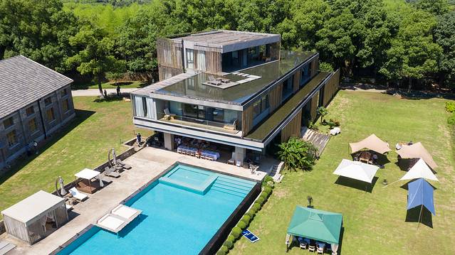 一个巨大的游泳池,加上旁边的躺椅和太阳伞,成功营造出海滨度假的氛围。旁边有巨大的草坪,即便是夏日,在草坪上撑起阳伞,也不会觉得闷热。在草坪上享用午餐后,下午开始体验各种项目。