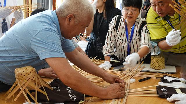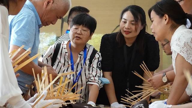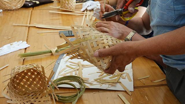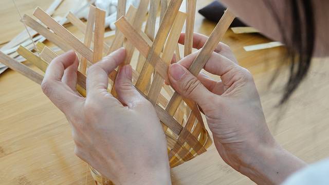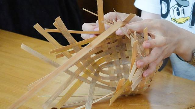 饭后的任务是用事先准备好的竹片编一个果篮,对于大多数人来说,这是个很难完成的任务。