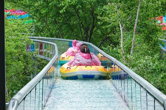 在起漂处,那密密麻麻的充气阀足以看出这里的受欢迎程度。每到周末,这里千船竞发的场面非常壮观。在七彩玻璃滑道上坐上水滑皮艇,高速滑行急速转弯,溅起层层水花,在呐喊中让人清凉。