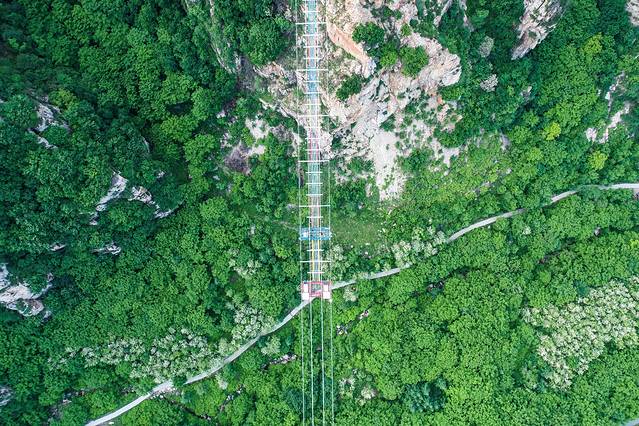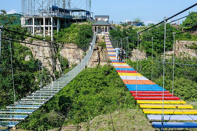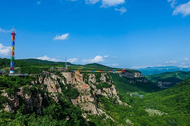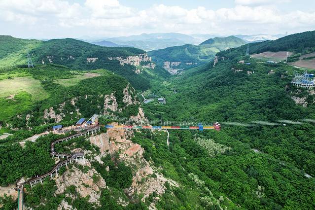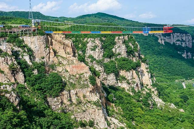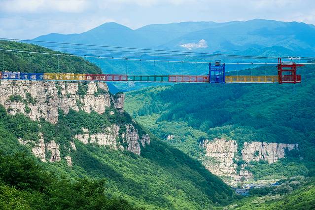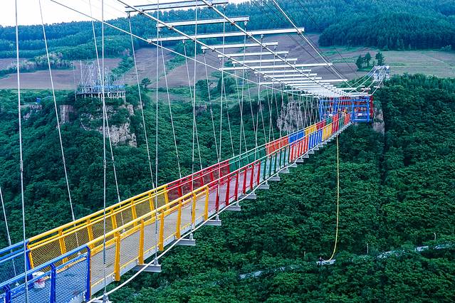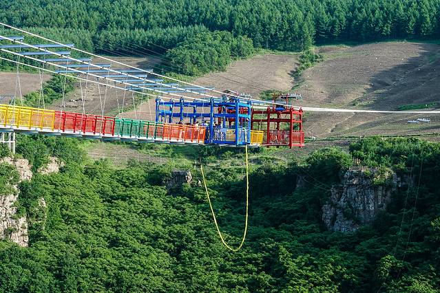 玻璃悬索桥 是东北地区最长最壮观的玻璃吊桥,在山两边架设铁索,铺上玻璃,走在上面,真的是步步惊心。长369米,最高落差158米,透明玻璃铺设,相当于在52层楼高上行走。一低头就是悬崖山谷,一抬头就是蓝天白云。