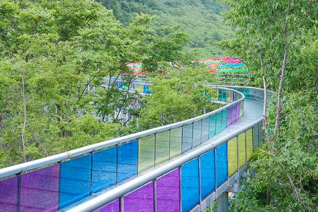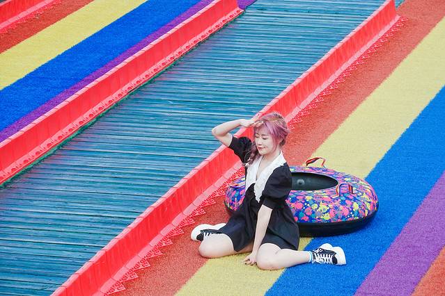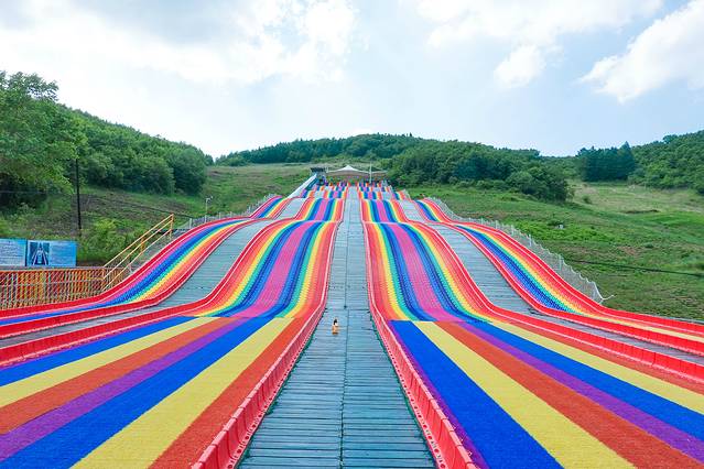 彩虹滑道,仿佛一条彩虹挂在山坡上,谁又没有一个在彩虹上大滑梯的梦呢?
